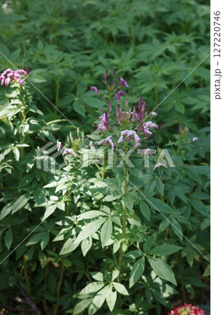 粉紅色花朵與草地景觀