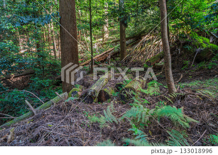 京都東山森林景色,山上倒伏著腐朽的樹木,京都市