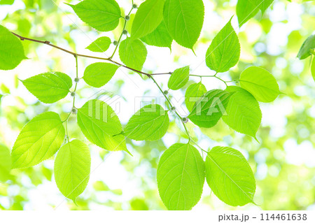 抬頭看新綠的樹木,一片新綠與藍天的風景,新綠在藍天映襯下閃閃發亮,抬頭看新綠的季節樹木,沐浴在陽光下