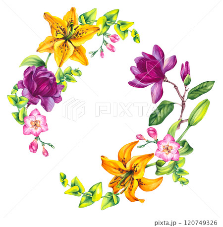 Floral illustration with freesia magnolia and lily