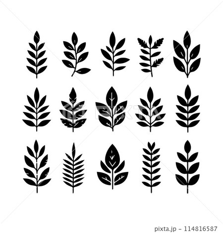 Collection of twelve botanical foliage elements arranged in a grid on a white background design style