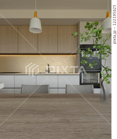 A modern kitchen featuring sleek cabinetry, stylish lighting, and a touch of greenery, creating an inviting and contemporary atmosphere. 3d rendering.