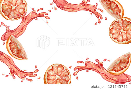Frame of grapefruit segments and juice splash watercolor illustration isolated on background. Ripe citrus fruits slices and halves hand painted. Fresh juicy tropical fruits drawing on border.