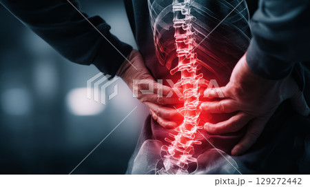 Lower back pain concept with highlighted spine and hands pressing painful area on body, showing discomfort and injury