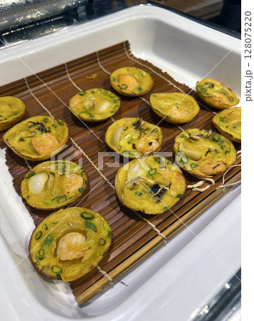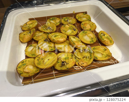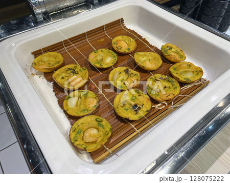 在自助餐廳裡拍攝擺放整齊的越南小煎餅