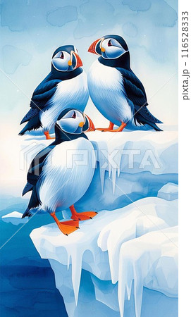 Puffins on snowy cliffs, icy ocean in background, North Pole environment, Watercolor style