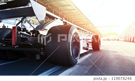 sleek racing car positioned on track, showcasing its powerful rear tires and aerodynamic design, ready for thrilling race. sun sets in background, enhancing excitement