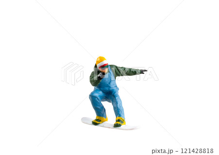 Miniature figurine depicting a snowboarder in mid-motion isolate on white background with clipping path