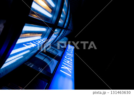 藍色霓虹燈與弧形線條營造都市夜景 | 名古屋錦町未來主義建築外觀