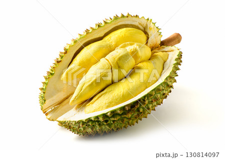 Ripe durian fruit or Durio zibethinus with yellow creamy pulp exposed, isolated on white background. Known as the king of fruits in Southeast Asia. Popular in Thailand, Malaysia, and Indonesia.