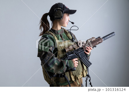 A caucasian woman in a bikini holds a machine gun against a brick wall.