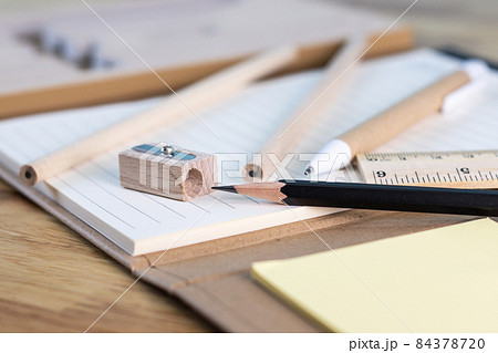 selective focus pencil for writing and paper book on wood table concept equipment office and school
