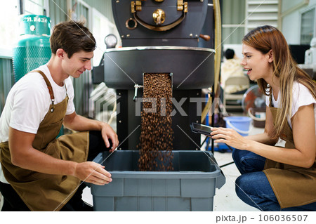 Professional male and female coffee roasters working with modern automated roasting machine in the coffee roasting factory. Coffee roasters checking or inspecting the roasting quality of coffee bean.