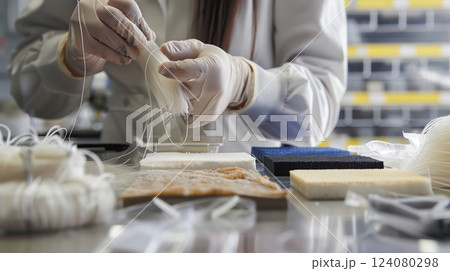 Researcher meticulously layers composite materials, with fibers and resins precisely arranged on the workbench.