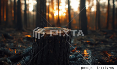 tree stump in deforested area with warm sunset glow