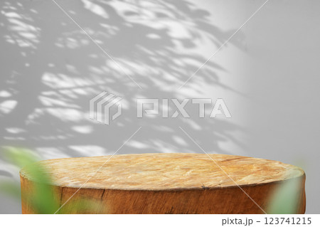 Tree stump with tree shadow drop on white wall background for mockup product display
