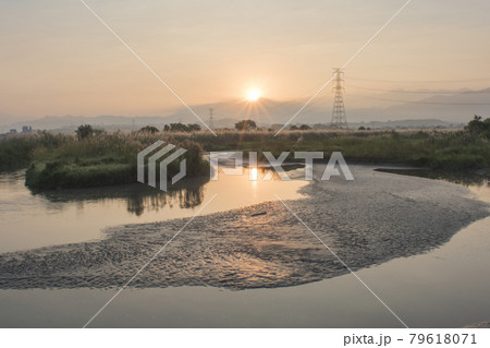 太陽漸漸升起,空氣中美麗的薄霧和陽光反射在河面上。