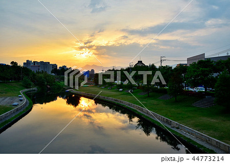 太陽升起,美麗的高野香澄,在城市城堡的河邊上映照。