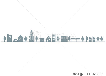 Town and village houses on skyline. Silhouette of small buildings in neighborhood on white background. Christmas rural simple drawing. Winter country landscape with trees in night. Vector