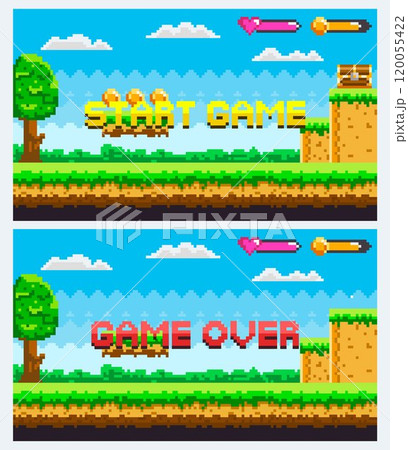 Start game and game over screens are shown on a pixelated video game interface. Both screens include a tree, heart, coin, and sword indicators, with a background of clouds and sky. Ideal for retro