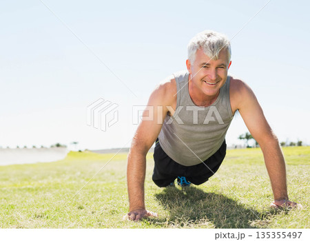 Senior male performing push-ups on grass field wearing grey tank top and blue-accented sneakers
