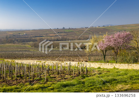 Vineyards with blooming trees in Romaneche Thorins, France