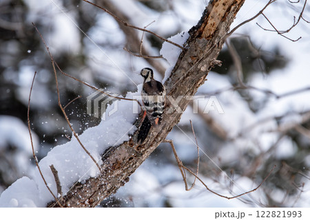 一隻大斑啄木鳥,它的喙被雪覆蓋