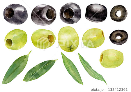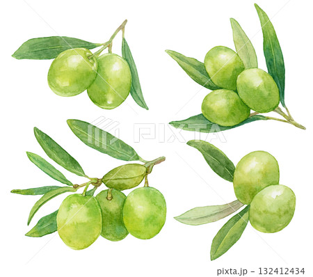 青橄欖果實與枝葉素材組水彩插畫集