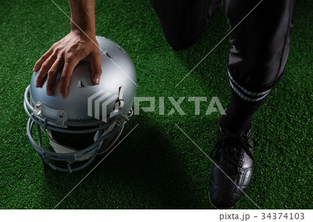 Composite image of american football player looking down while h