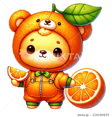 Adorable bear character in orange outfit holding oranges. Animal cartoo0 character