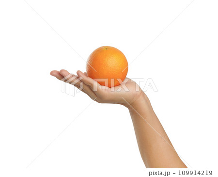 With an orange in hand. Young caucasian woman with slim body shape is indoors in the studio