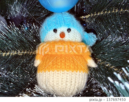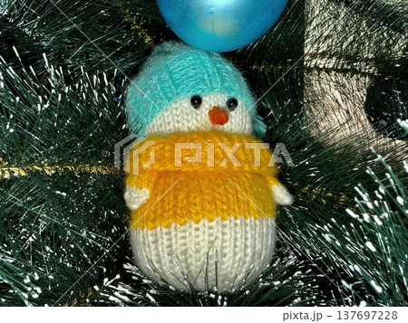 adorable knitted snowman ornament with blue hat and yellow sweater on christmas tree for holiday branding