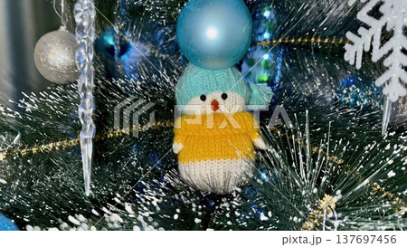 adorable knitted snowman christmas ornament balancing blue bauble amid sparkling tree branches with snowflakes and icicles cozy festive decor for holiday wallpaper or greeting card background