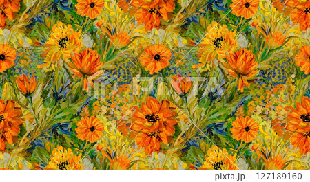 Seamless autumn pattern with pumpkins, leaves and flowers. Handmade watercolor illustration. Color image. For packaging, decor, textiles and wallpaper. As well as for printing and wrapping paper.