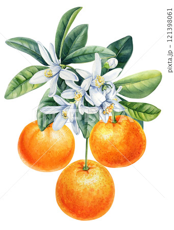 Orange branch, green leaves flowers. Watercolor citrus fruit mandarin botanical orange illustration isolated background