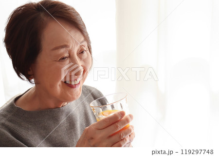 Korean adult female sitting at dining table holding glass of orange juice against curtain backdrop