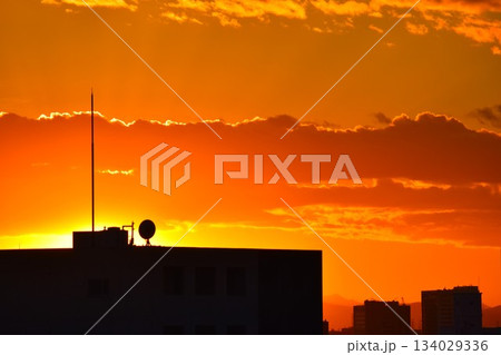 郊區的日落景觀和富士山的景色。神奈川縣平塚市