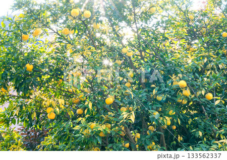 柿子樹枝的特寫,上面掛滿了橘色的果實。