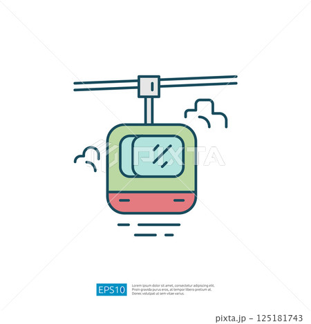 A simple illustration of a cable car, suspended from a cable, designed with a minimalist style and soft colors. It represents transport and leisure activities in mountainous areas.