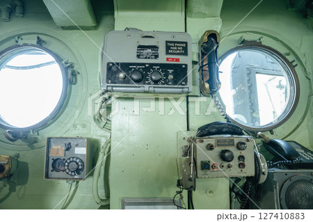 Old naval communication units and handsets mounted on a pale green wall between two round portholes. The equipment includes analog dials, rotary phones, and military intercom systems.