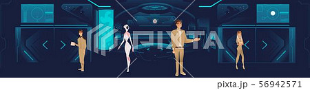 Spaceship cabin. Futuristic interface of spacecraft with user dashboard panels controlling systems garish vector cartoon background