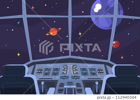 Spaceship cockpit interior, control panel dashboard with glowing buttons and panoramic space view with planets and twinkling stars appear through the window. Futuristic cartoon vector scifi space ship