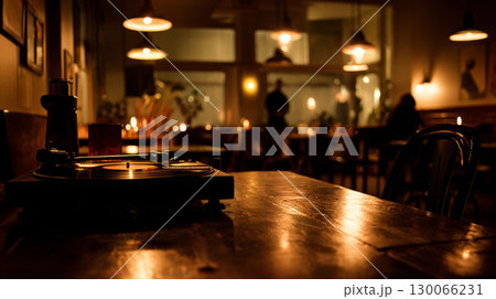 夜晚的咖啡廳內部,沐浴在溫暖的燈光下,配有唱片機