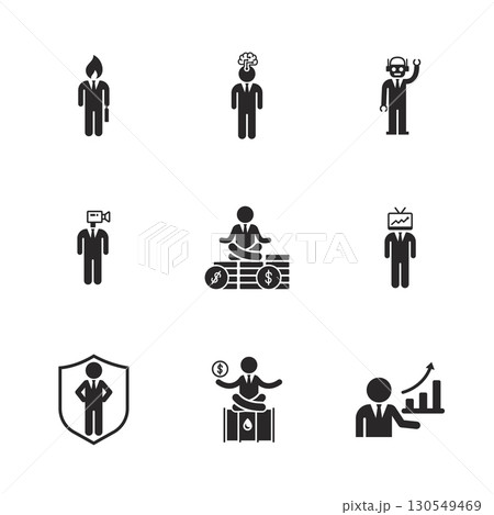 Creative businessman icon set showing modern work, finance, AI, tech, and growth concepts in solid style