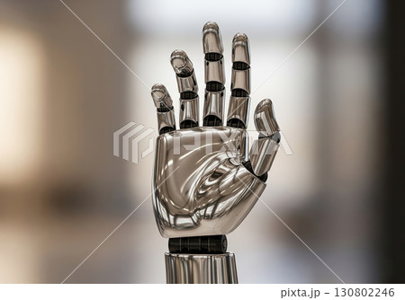 Sleek robotic hand with metallic reflective surface reaching upward against clean simple background representing advanced futuristic high-tech technology and engineering design concept
