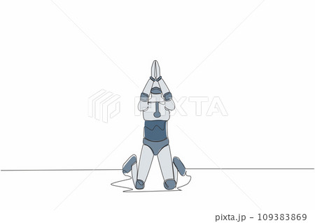 Single one line drawing robot kneeling and pray. Loss money, economy crisis, bankrupt, depressed. Robotic artificial intelligence. Technology industry. Continuous line draw design vector illustration