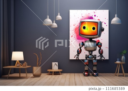 AI-generated content. Generative AI art technology concept, robot painting picture in studio. comeliness