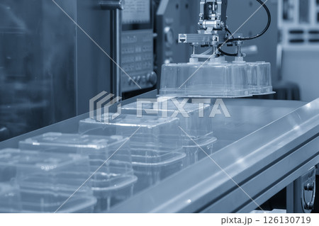 Close up scene material handling process the food container by robotic system from injection machine in the light blue scene.