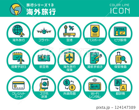 旅行系列 13: 海外旅行: 一組顏色線圖標