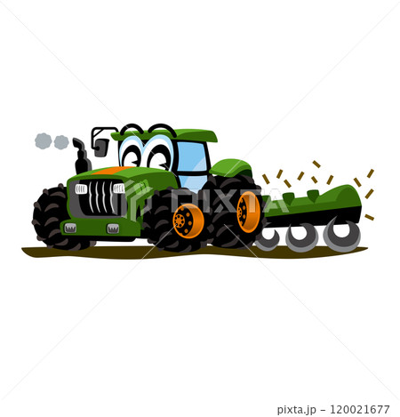 Tractor moves harvested crops while unloading into a trailer on a vast agricultural field under a clear blue sky
